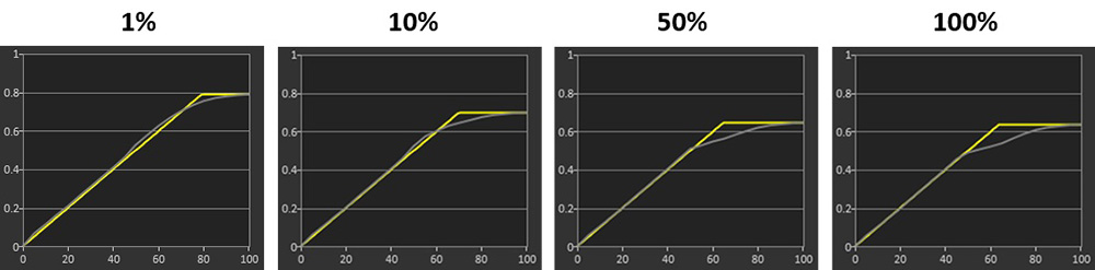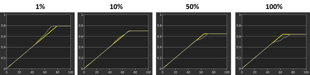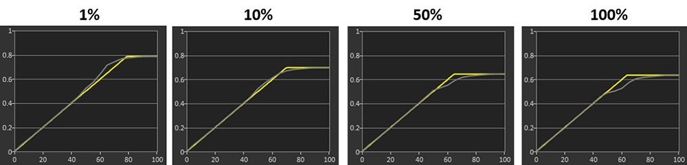 The EOTF tracking in the True Black 500 mode remains nice and accurate still but the other 3 modes show a small increase in brightness beyond the target for mid grey shades. This is at a standard 10% APL test, but it’s useful to evaluate each mode more thoroughly at different APL: