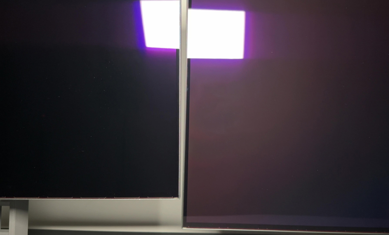 - The pinkish tint to reflected lights is the same on both – both of these new True Black glossy coated panels show that same pinkish tint to the reflection of the light source. It can’t be specific therefore to the Primary RGB Tandem panel structure, or indeed to the older MLA layer. It must be a “feature” of the coating finish itself. Again this only impacts reflections, not the image on the screen.