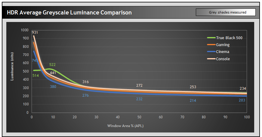 Surprisingly in all of these modes the peak white luminance measurements were the same. We expected the True Black 500 (TB500) mode to perform like this, but expected the other 3 modes to offer higher peak brightness – that’s how these modes are usually configured. If you look in the menu at the brightness setting it is greyed out but suggests it is set to 100 in each of those modes too.