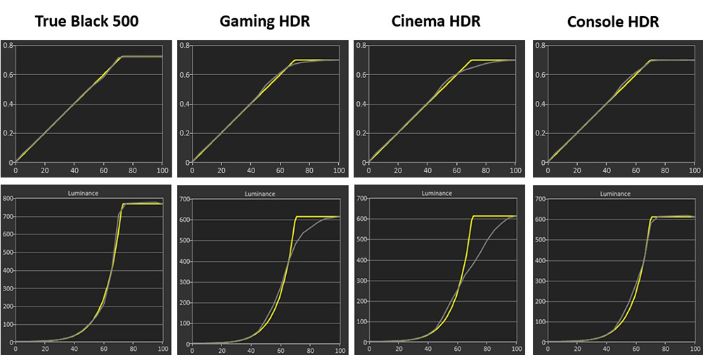 We first measured the PQ EOTF tracking in each of the four modes which is shown above. You can see that the True Black 500 mode provides very accurate tracking here which is typical for these specific modes, designed to conform to the VESA DisplayHDR certification and testing process. The Console HDR mode was also very accurate in these tests, with the Gaming and Cinema HDR modes showing some progressively more drastic roll-off for mid-to-light grey shades, causing those shades to look a little darker than intended. Before we draw any conclusions here though we need to talk about brightness…
