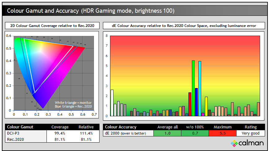 All four modes showed very similar colour gamut and colour accuracy in HDR so we’ve provided the results from the Gaming HDR mode above. Interestingly in HDR the active colour space is a little less than in the native SDR mode, reaching ~111% relative DCI-P3 coverage as opposed to ~122% we’d seen earlier in SDR. This seems to be in order to remove the over-coverage in blues/purples from the Rec.2020 colour space, and acts like a Rec.2020 clamp for HDR content so that’s a good thing.