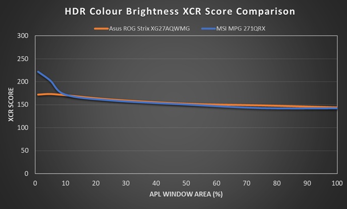 You can see by comparison that a QD-OLED panel (the 27″ 1440p, 360Hz, MSI MPG 271QRX being used here as an example) can maintain high colour brightness even at the smaller APLs below 10%. If you consider the direct comparison graph the MSI, which represents a typical modern QD-OLED panel, is actually slightly darker by around 2% for colours in higher APL scenes (brighter scenes), but most notably it reaches up to 22% brighter for the smaller APL (highlights in dark scenes) where the lines on the graph separate significantly.